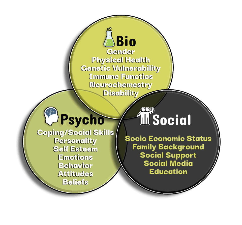 biological: This component considers the biological or physiological aspects of health and illness. It encompasses factors such as genetics, the functioning of bodily systems (e.g., cardiovascular, nervous, immune), and the presence of any diseases or physical conditions. Biological factors also include genetic predispositions to certain illnesses and how an individual’s body responds to various stressors and pathogens.